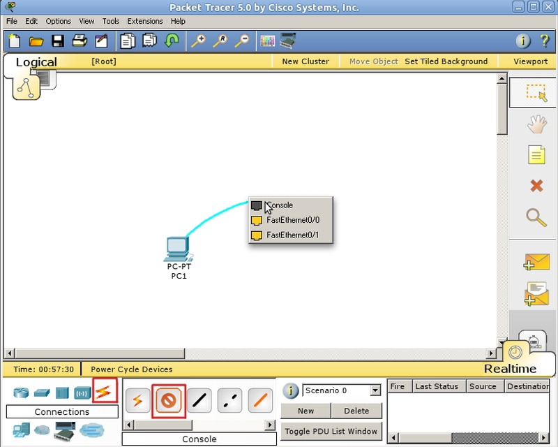 Что бы вы делали, если бы это был самый взаправдашний железный маршрутизатор? Взяли бы консольный кабель и подключились им в него и в компьютер. То же самое сделаем и тут: