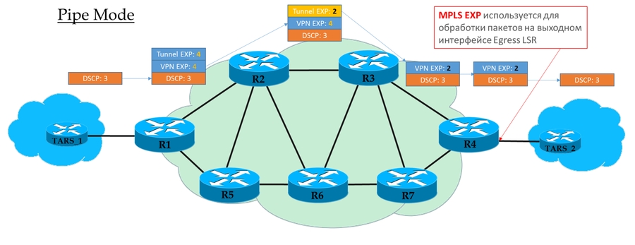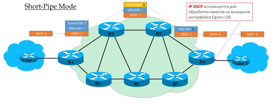 Этот режим вы можете рассматривать вариацией Pipe-mode. Разница лишь в том, что на выходе из MPLS-сети пакет обрабатывается в соответствие с его полем IP DSCP, а не MPLS EXP. Это означает, что приоритет пакета на выходе определяется клиентом, а не оператором. Ingress PE не доверяет IP DSCP входящих пакетов Транзитные P смотрят в поле EXP верхнего заголовка. Предпоследний P снимает транспортную метку и копирует значение в VPN-метку. Egress PE сначала снимает метку MPLS, потом обрабатывает пакет в очередях. Объяснение от cisco.