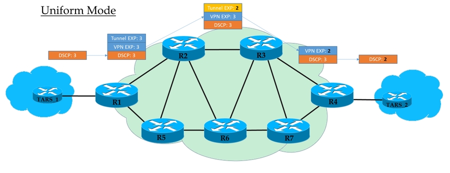 На Ingress PE мы доверяем IP DSCP и копируем (строго говоря, отображаем, но для простоты будем говорить «копируем») его значение в MPLS EXP (как туннельный, так и VPN заголовки). На выходе с Ingress PE пакет уже обрабатывается в соответствии со значением поля EXP верхнего заголовка MPLS. Каждый транзитный P тоже обрабатывает пакеты на основе верхнего EXP. Но при этом он может его поменять, если того хочет оператор. Предпоследний узел снимает транспортную метку (PHP) и копирует значение EXP в VPN-заголовок. Не важно, что там стояло — в режиме Uniform, происходит копирование. Egress PE снимая метку VPN, тоже копирует значение EXP в IP DSCP, даже если там записано другое. То есть если где-то в середине значение метки EXP в туннельном заголовке изменилось, то это изменение будет унаследовано IP-пакетом.